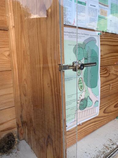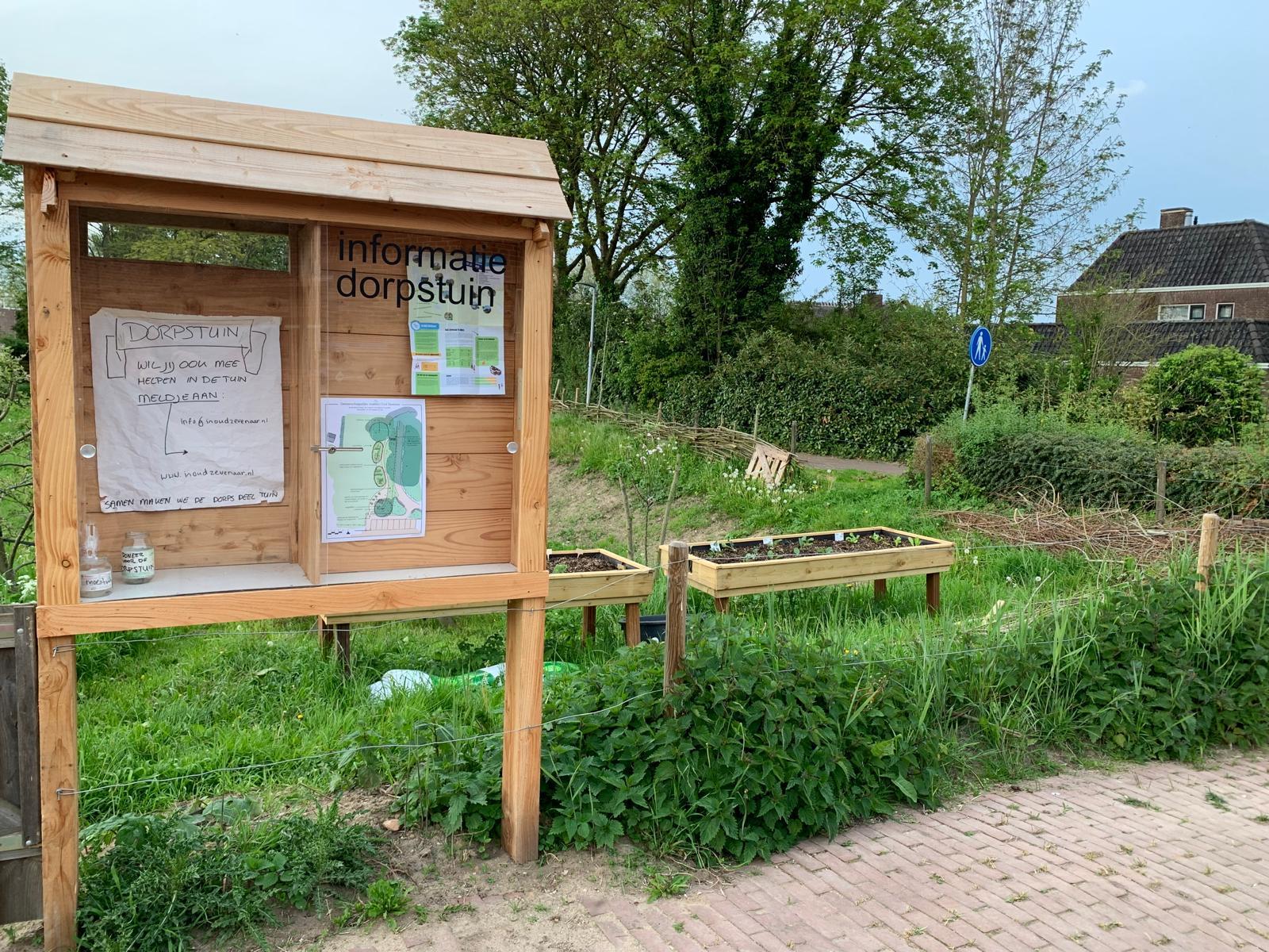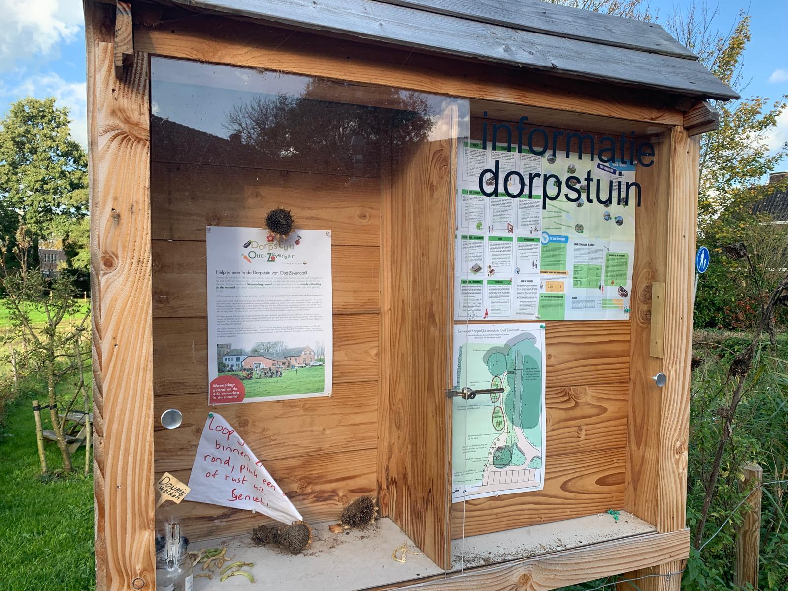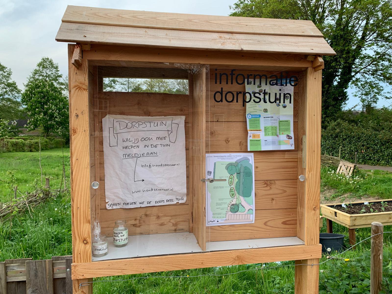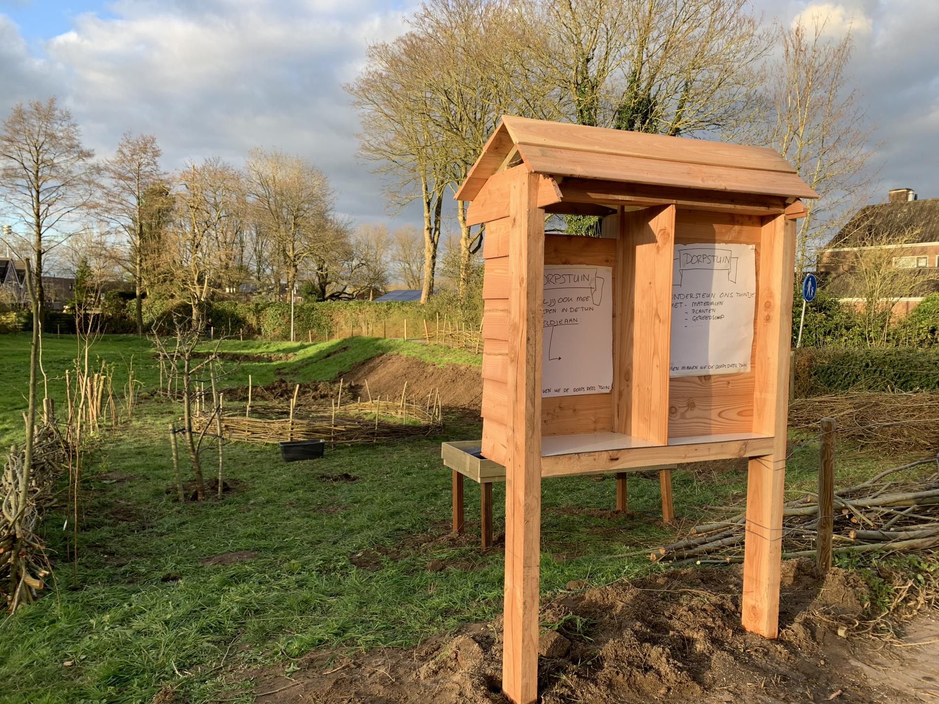 Een mooie informatiekast bij de ingang van de dorpstuin neergezet