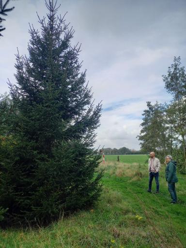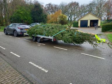 De Kerstboom, die al in oktober 2025 is uitgezocht en dan nog mag doorgroeien tot begin december, werd op 6 december met een extra lange aanhanger opgehaald in De Heurne.